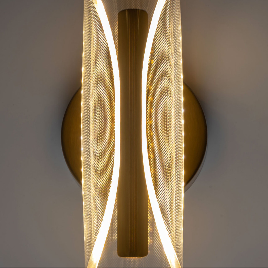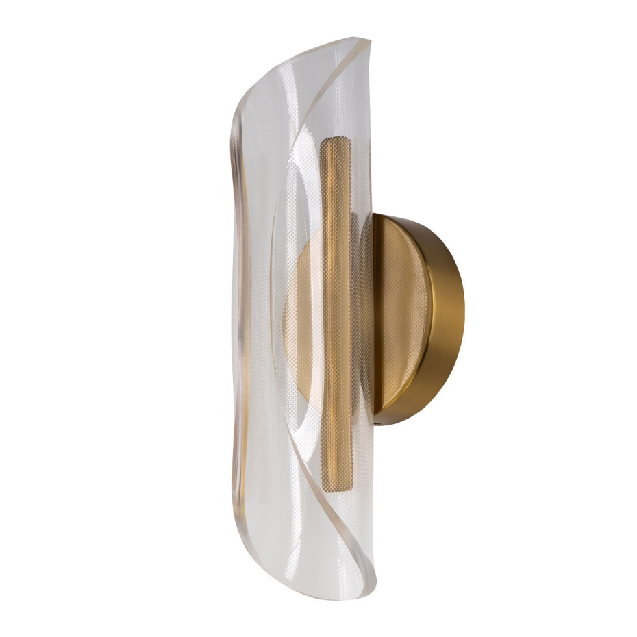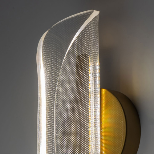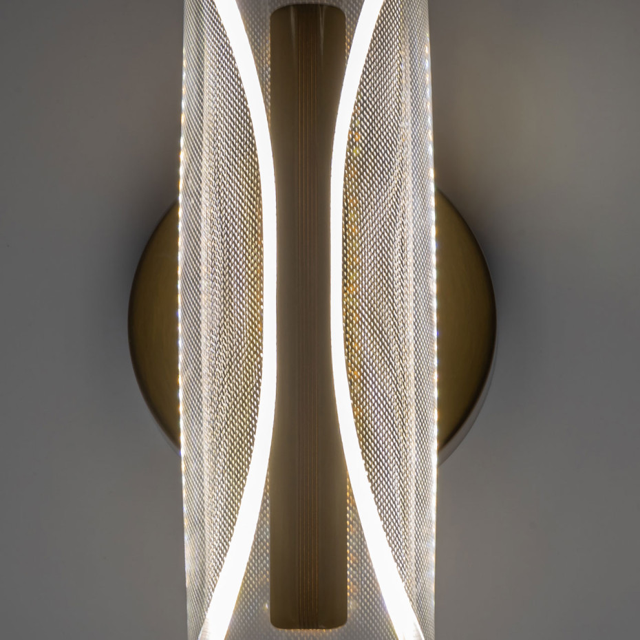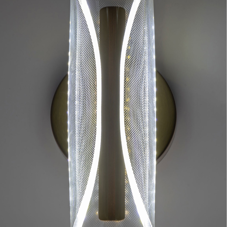 Металлический корпус настенного бра гальванизирован в цвет бронзы. Вертикальное бра декорировано изящным элементом из прозрачного акрила с точечным рисунком.