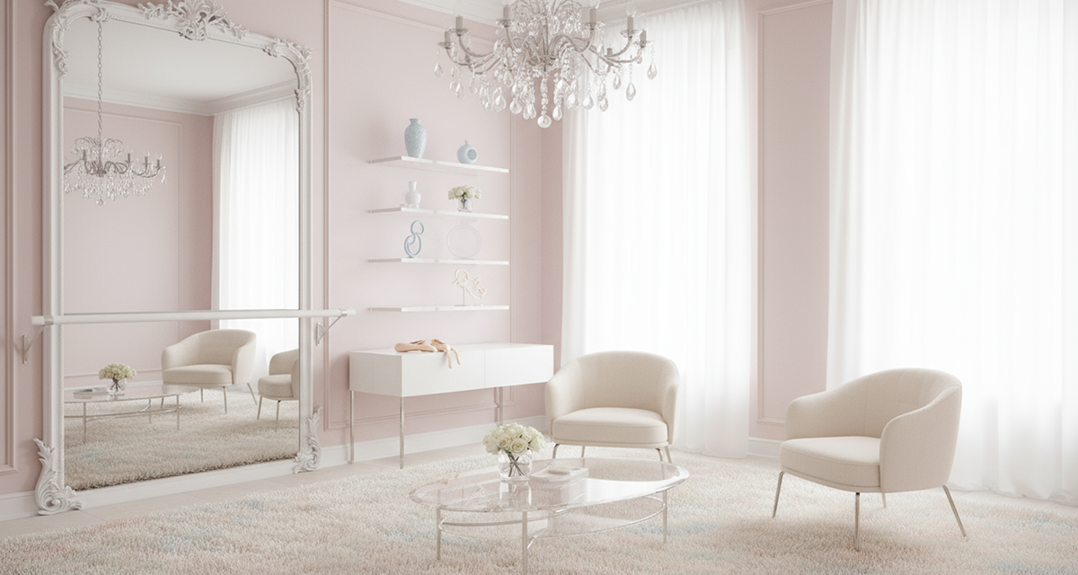 Для балетной эстетики основой станет светлая цветовая палитра: оттенки белого, слоновой кости, нежно-розовые и голубые тона. Мебель должна создавать ощущение невесомости — выбирайте модели на тонких металлических ножках, прозрачные акриловые элементы, подвесные полки. Зеркала в изящных рамах не только визуально расширят пространство, но и отсылают к балетным классам.